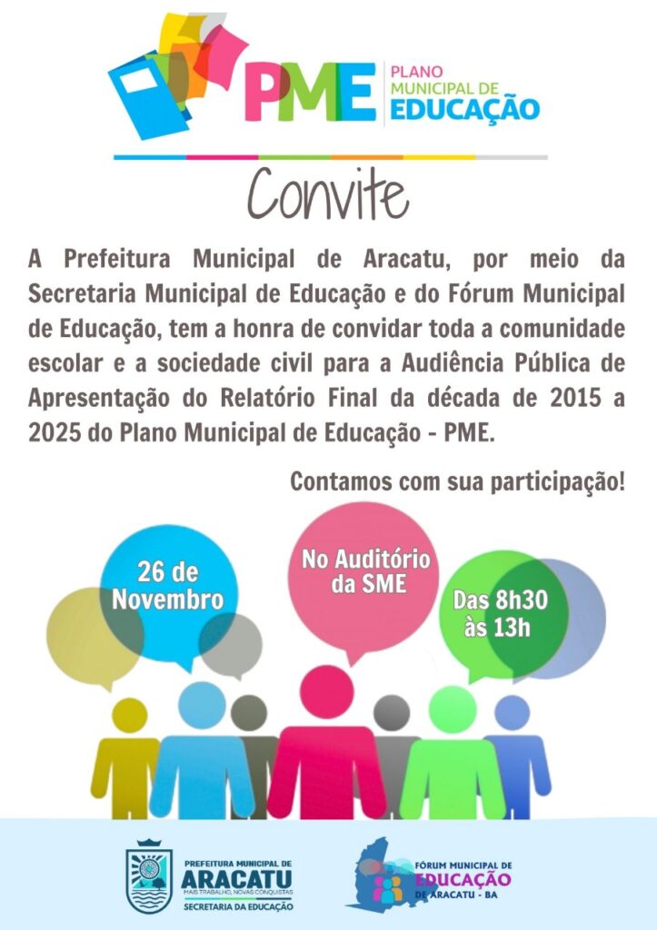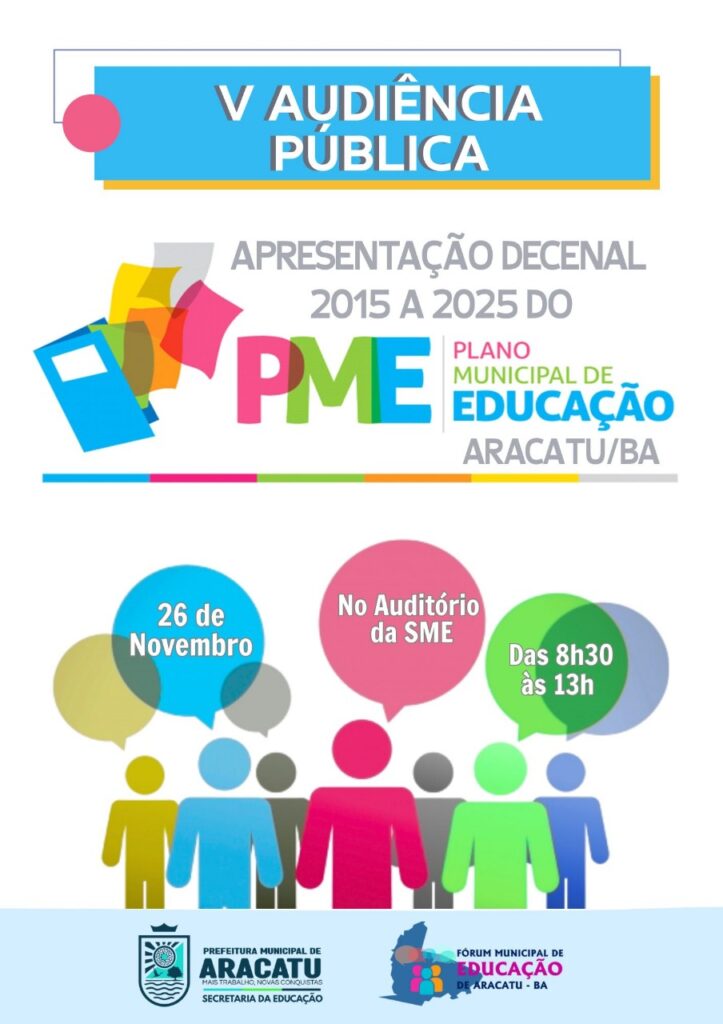 A Prefeitura Municipal de Aracatu, por meio da Secretaria Municipal de Educação e do Fórum Municipal de Educação, tem a honra de convidar toda a comunidade escolar, profissionais da área, pais, estudantes e a sociedade civil para participar da V Audiência Pública de Apresentação do Relatório Final do Plano Municipal de Educação (PME) – Decênio 2015 a 2025.